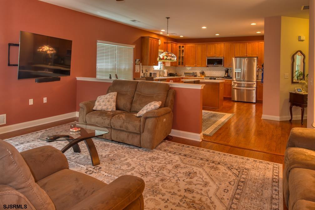 Your next chapter begins with this beautiful Eden model home in the very desirable Village Grande at English Mill! Conveniently situated in Egg Harbor Township everything is just minutes away - beaches, shopping, restaurants, parks and more! On the outside of the home, mature landscaping makes the perfect first impression. Upon entering the home you are greeted with an open floor plan. Gleaming hardwood floors lend an air of elegance to the living and dining room. High ceilings and large windows bring the outside in with plenty of natural light. Just around the corner you'll find the spacious eat-in kitchen featuring a center island, tons of cabinets, new quartz countertops and backsplash and a pantry closet. The final touch to this fabulous kitchen is 1 year old appliances! Off the kitchen is a tv room, perfect for winding down at the end of the day! A first floor primary suite complete with walk-in closets and a luxurious en-suite bathroom, including separate shower and soaking tub, makes for the perfect retreat. Just off the dining room is a laundry room, access to the 2 car garage and a guest bath. Bonus room off the tv room, perfect for a home office, craft room or library reading room. Upstairs are two more bedrooms and a full bath - ideally situated for visitors to have privacy! A patio off the back of the home is waiting for you to enjoy your morning coffee or evening beverage. Brand new high efficiency gas furnace that will ensure your comfort. The clubhouse offers indoor and outdoor pools, sauna, gym, card room, ballroom, pickleball and more!