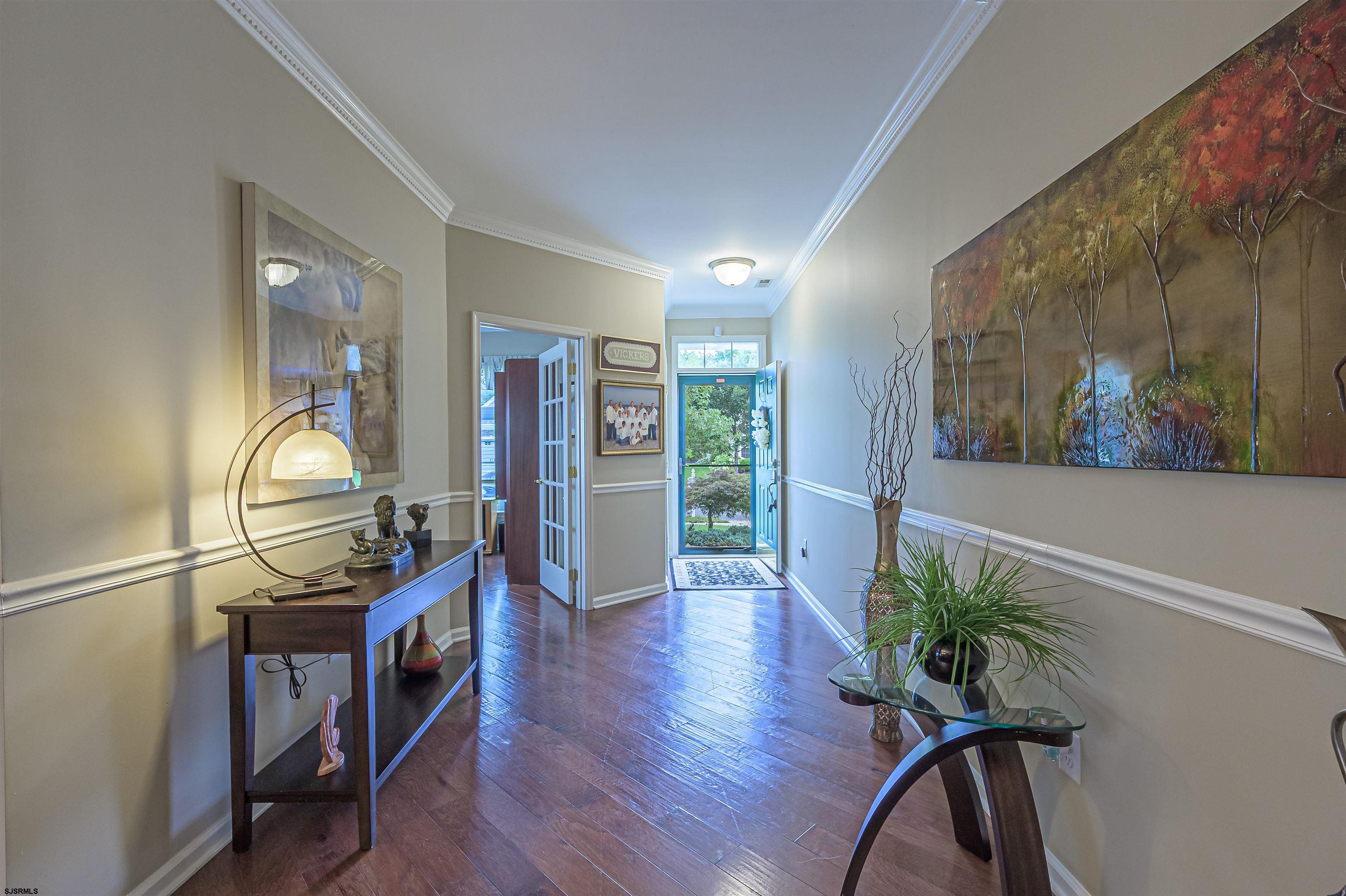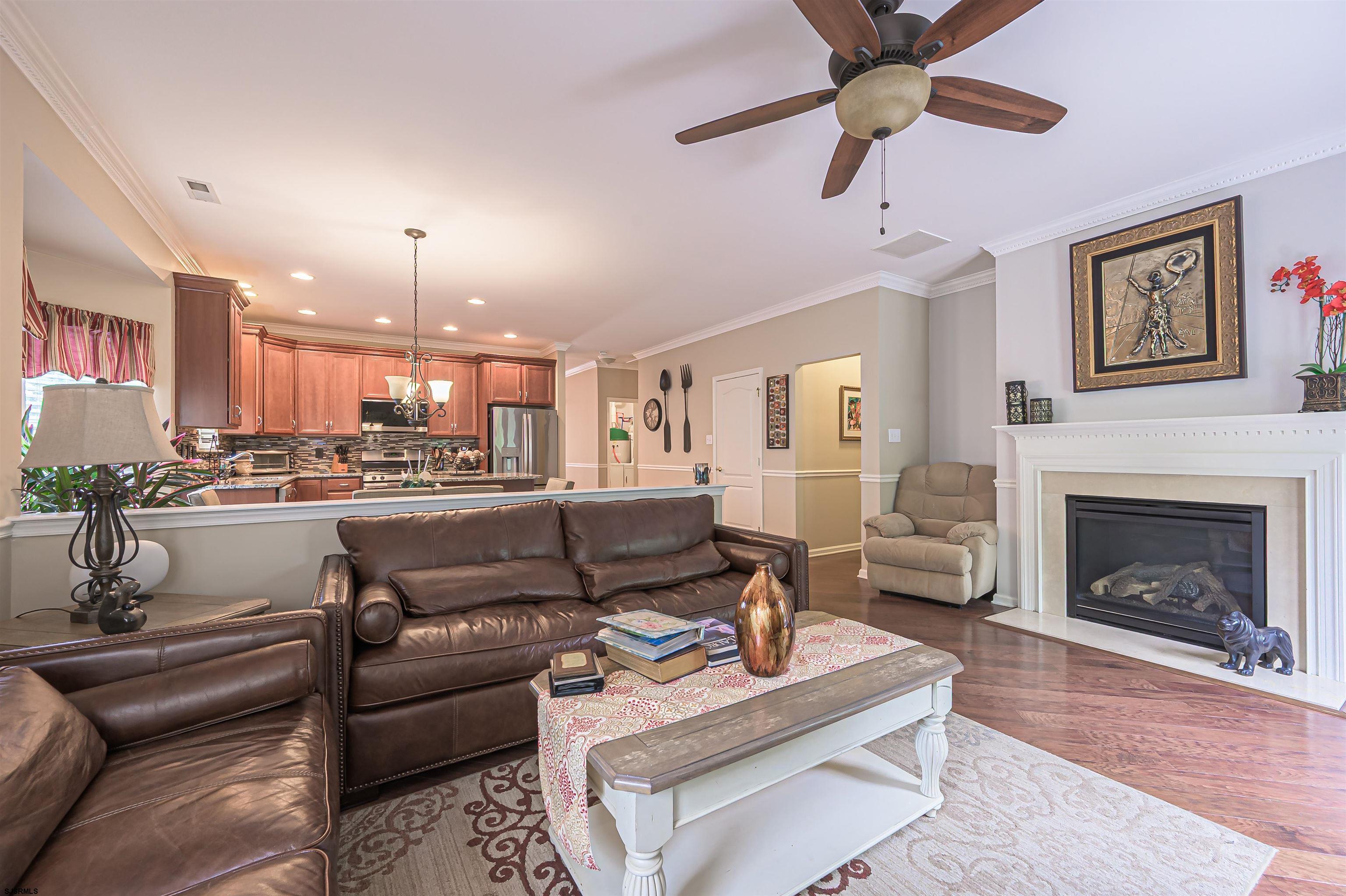 Welcome to The Village Grande at English Mill, Egg Harbor Township s premier 55+ active adult community. This beautifully appointed 2-bedroom, 2-bath rancher with a versatile flex room offers refined single-level living with custom details and resort-style amenities. Once inside, admire the wide-plank, hand-scraped wood floors that flow through the main living areas of the open-concept design, accented by crown molding and wainscoting for timeless elegance. The gourmet kitchen features granite countertops, stainless steel GE Profile appliances, a breakfast counter with seating, and abundant cabinetry perfect for both everyday meals and entertaining. The primary suite is a true retreat, boasting two walk-in closets and a spa-inspired bathroom. A flexible bonus room can serve as a home office, den, or potential third bedroom, while the second bedroom and full bath provide ideal space for guests. Step outside to enjoy your private patio with a retractable awning, overlooking professionally landscaped grounds and widespread forestry. A charming family of wild turkeys often visits the backyard, adding to the natural beauty and unique allure of your new home. Additional conveniences include a two-car garage, laundry room, fireplace, and energy-efficient upgrades throughout. The community amenities are second to none, featuring a clubhouse, fitness center, indoor and outdoor pools, as well as pickleball and tennis courts, and bocce courts. All of this, just minutes from shopping, dining, entertainment, and the Jersey Shore. Agents, please read the Agent Remarks.