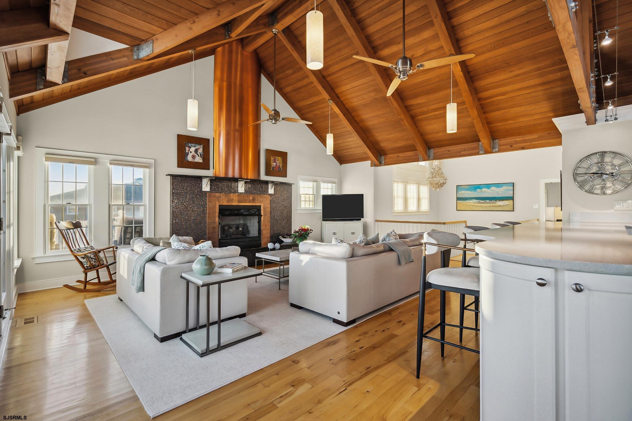 Discover a magnificent beachside home located in the esteemed Gardens section of Ocean City. This beautiful property blends coastal charm with serene tranquility, presenting a rare chance to soak in the ocean s beauty. Situated along the beachfront and on a spacious 60 x 130-foot lot, this residence offers direct access to the beach, allowing you to relish soothing ocean breezes right from your doorstep. This single-family home offers an impressive 4,100 square feet of stylishly crafted living space, featuring 4 spacious bedrooms and 3.5 bathrooms, making it an ideal sanctuary for those who value both comfort and style. Upon entering, your eyes are immediately drawn upwards to the sophisticated exposed-wood-beam cathedral ceilings that soar above the main living and dining areas, creating an expansive and welcoming vibe. Rich hardwood flooring flows throughout, offering warmth and natural elegance that complements the home's seaside charm. Culinary enthusiasts will delight in the state-of-the-art kitchen, equipped with Viking Professional Series appliances that promise a chef-quality experience. Savor the exquisite tile-and-copper backsplash of the fireplace, which adds a touch of artistry to the space. Further enhancing the home's charming atmosphere, each window reveals breathtaking ocean views. Step outside onto the expansive wrap-around porch and immerse yourself in the sweeping ocean sound and views. Breathe in the salty air as you unwind, captivated by the beauty of the horizon where the limitless sky meets the deep blue waves. Find serenity in the beautiful primary suite, your own private retreat, complete with a fully custom-tiled bath and a secluded deck. The first floor stands as a delightful getaway in itself, featuring a second family room that is tastefully furnished and equipped with a built-in bar, ice maker, and wine refrigerator, making it ideal for entertaining family and friends or a great ice cream bar for the little ones!. Another highlight on this level is the inviting sunroom, where sunlight streams in, brightening every corner. This floor also includes three generous bedrooms, two full bathrooms, and a laundry room. The outdoor living space is alluring, highlighted by a captivating in-ground pool the perfect setting for endless summer days filled with fun and relaxation. The exterior is thoughtfully designed, featuring an attached 2-car garage, a convenient shower cabana for rinsing off after a day at the beach, ample off-street parking, and much more. Whether you're in search of a timeless place to gather with family and friends or a quiet retreat to escape the everyday, make this home yours and indulge in the privilege of panoramic beach views and coastal living at the shore.