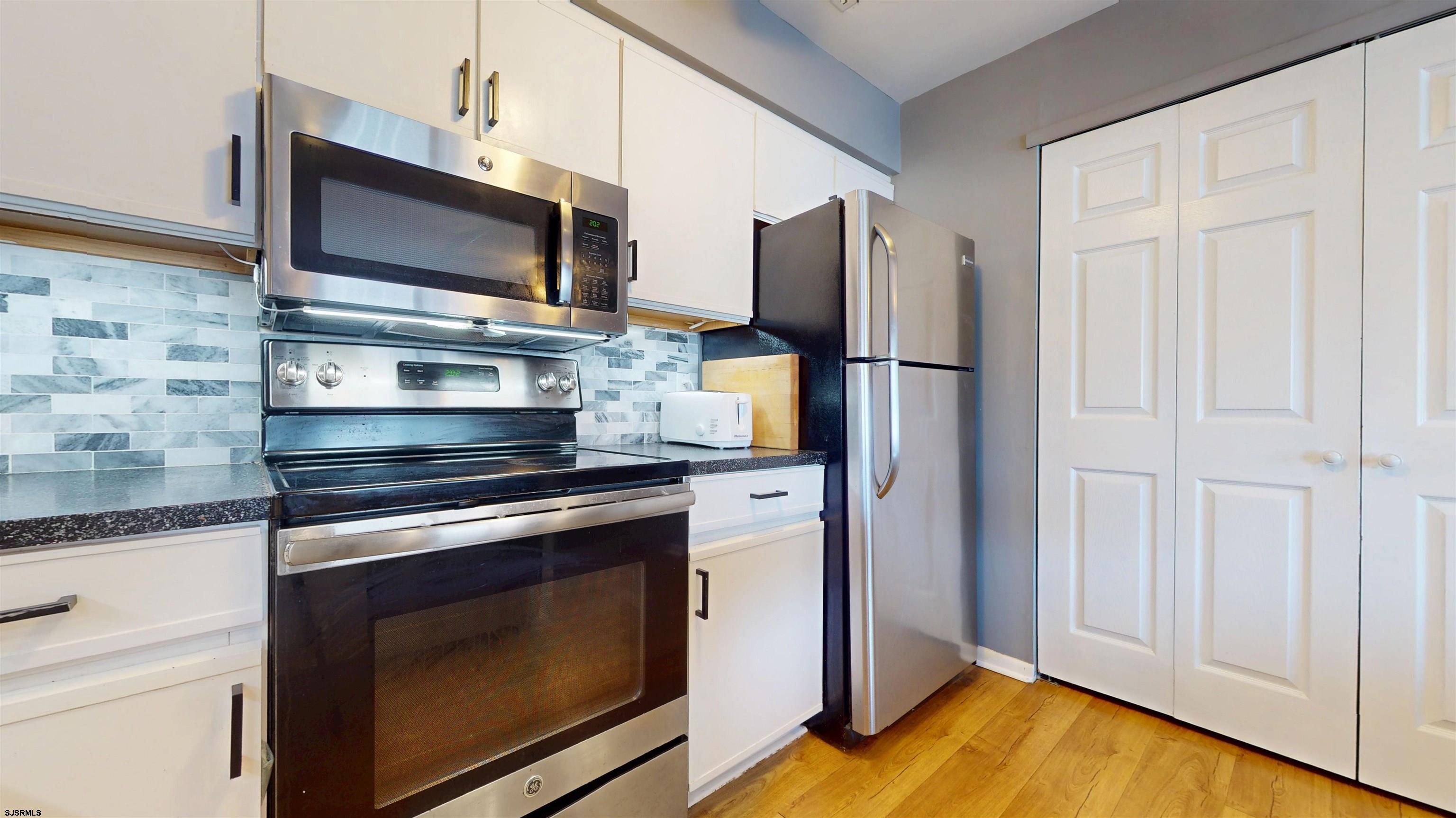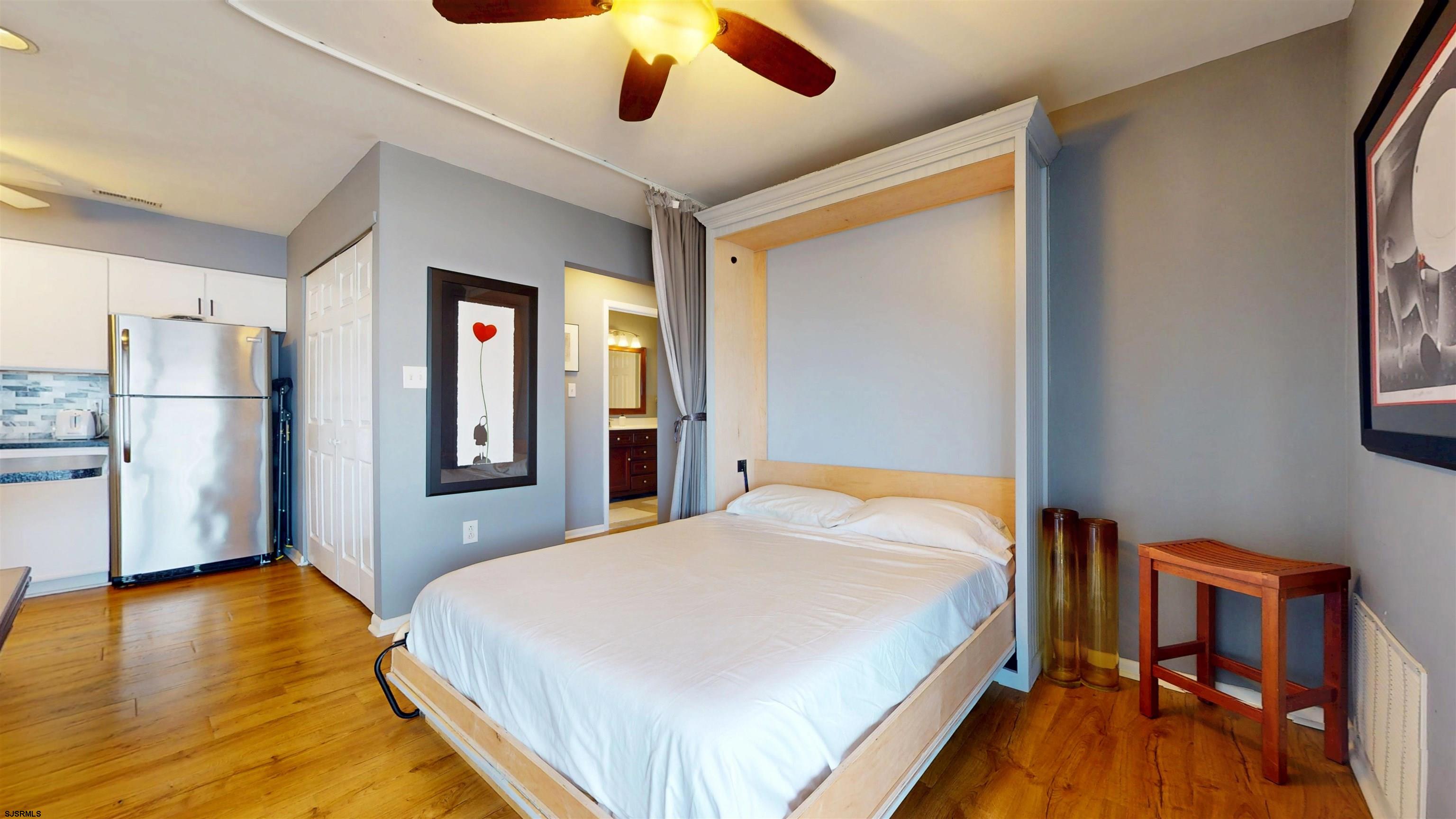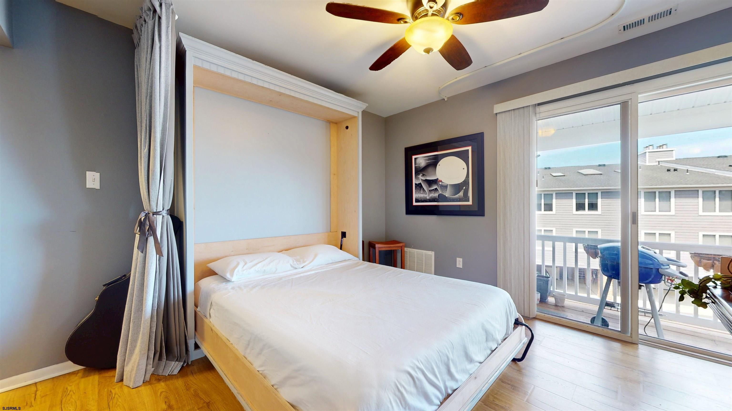 Welcome to your perfect summer escape at Harbor Cove in Somers Point, such a charming marina-front community nestled along Bay Avenue where coastal living meets everyday convenience. Perched on the top level of a three-story building, this one-bedroom residence offers elevated privacy, peaceful surroundings, and stunning morning sunlight that fills the space with warmth and energy. Step inside to find beautiful wood flooring throughout and a thoughtfully designed layout that maximizes both comfort and flexibility. The U-shaped kitchen is stylish and functional, featuring white cabinetry with black hardware, sleek black countertops, a gray, white and black stone backsplash, and a full suite of stainless steel appliances including a newer dishwasher, a microwave, fridge and an electric stove. Just off the kitchen and behind doors, a dedicated laundry space with newer high-end washer and dryer adds everyday ease. And the hot water heater is newer, and the HVAC is from 2021. The living space is warm and inviting, highlighted by a wood-burning fireplace with a classic mantle, perfect for cozy evenings after a day at the beach or marina. A unique and highly desirable feature is the flexible dining area that easily transforms into a private guest space, complete with a Murphy bed and ceiling-mounted track curtain, ideal for hosting summer visitors without sacrificing style or space. The spacious primary bedroom offers two closets and a convenient vanity area, while the updated bathroom is beautifully finished with a shower, modern sink, and toilet. Additional storage is thoughtfully integrated with a mirrored hallway closet, enhancing both functionality and light. Step outside to your generously sized private balcony, perfect for morning coffee, evening cocktails, or dining al fresco with an electric grill while enjoying the coastal breeze. This unit is located steps to the pool - but not too close for the noise! Provided two car parking per unit plus guest spots throughout the development. There is also a storage area for all the bikes, boards and beach chairs!! Harbor Cove s meticulously maintained grounds include a sparkling swimming pool and scenic marina setting, creating a true resort-style atmosphere. The location is unbeatable! Just a short stroll to local favorites like The Anchorage Tavern, live entertainment at the Somers Point Beach, performances at the Gateway Playhouse, and the beloved Friday night beach concerts. Plus, convenient access to Shore Medical Center adds peace of mind. Whether you re looking for a weekend getaway, summer retreat, or year-round coastal lifestyle, this Harbor Cove gem delivers the perfect blend of charm, flexibility, and location. And bonus - Seller is willing to pay for 6 months of the Association fees.